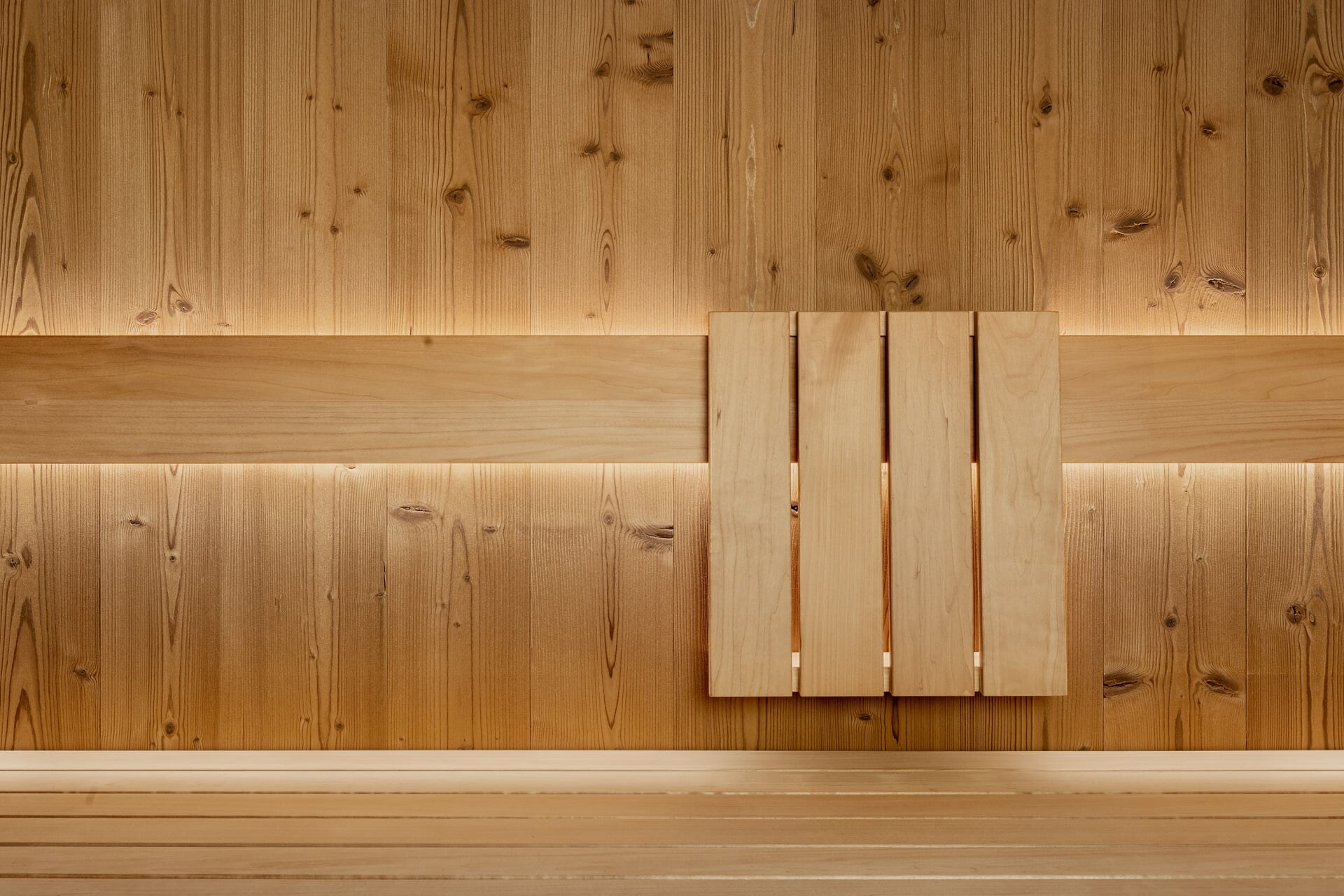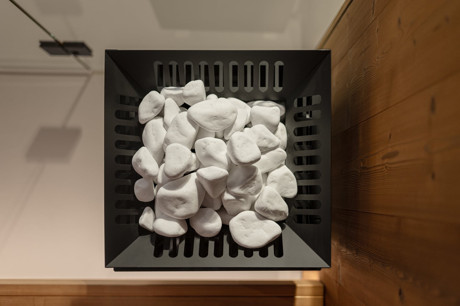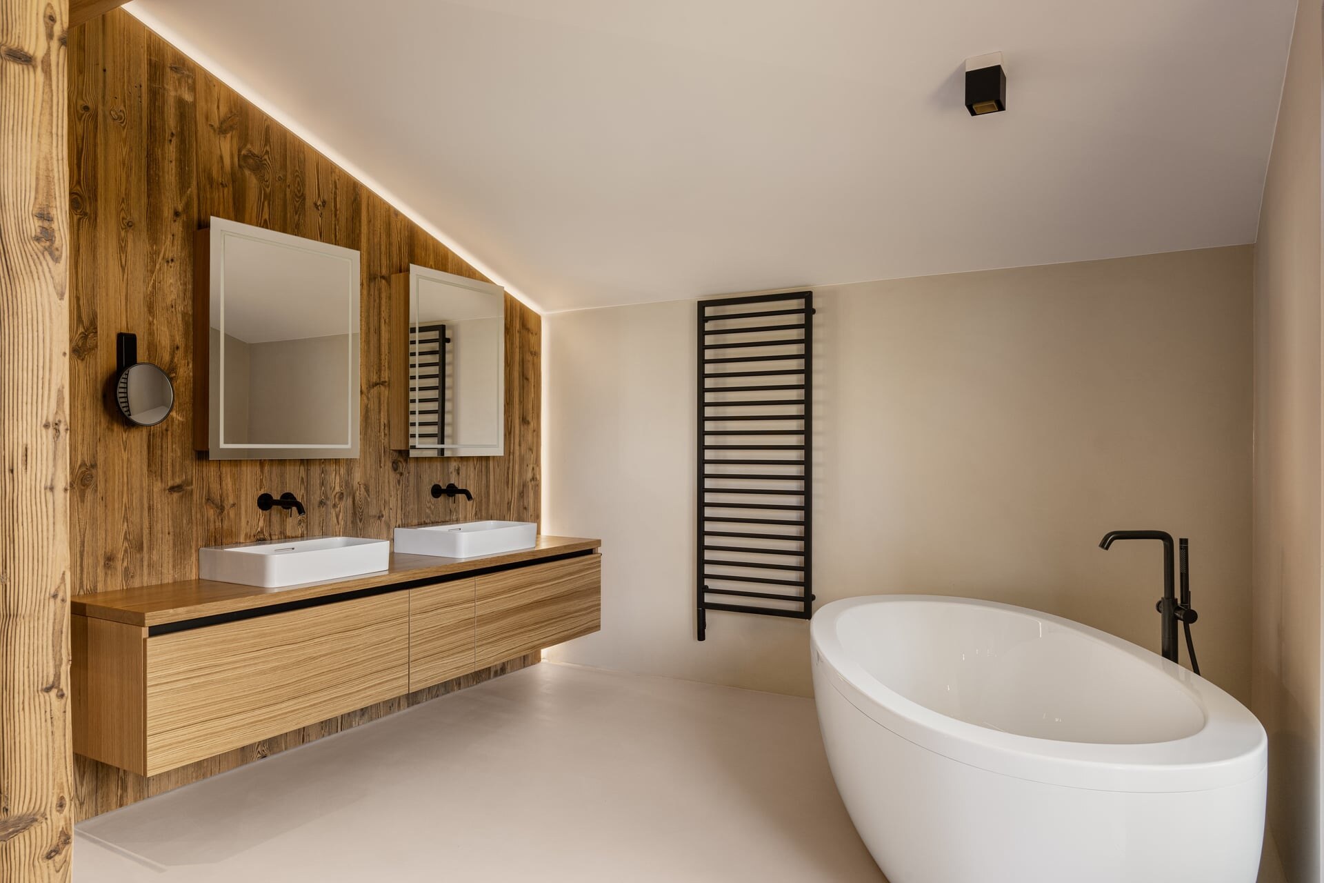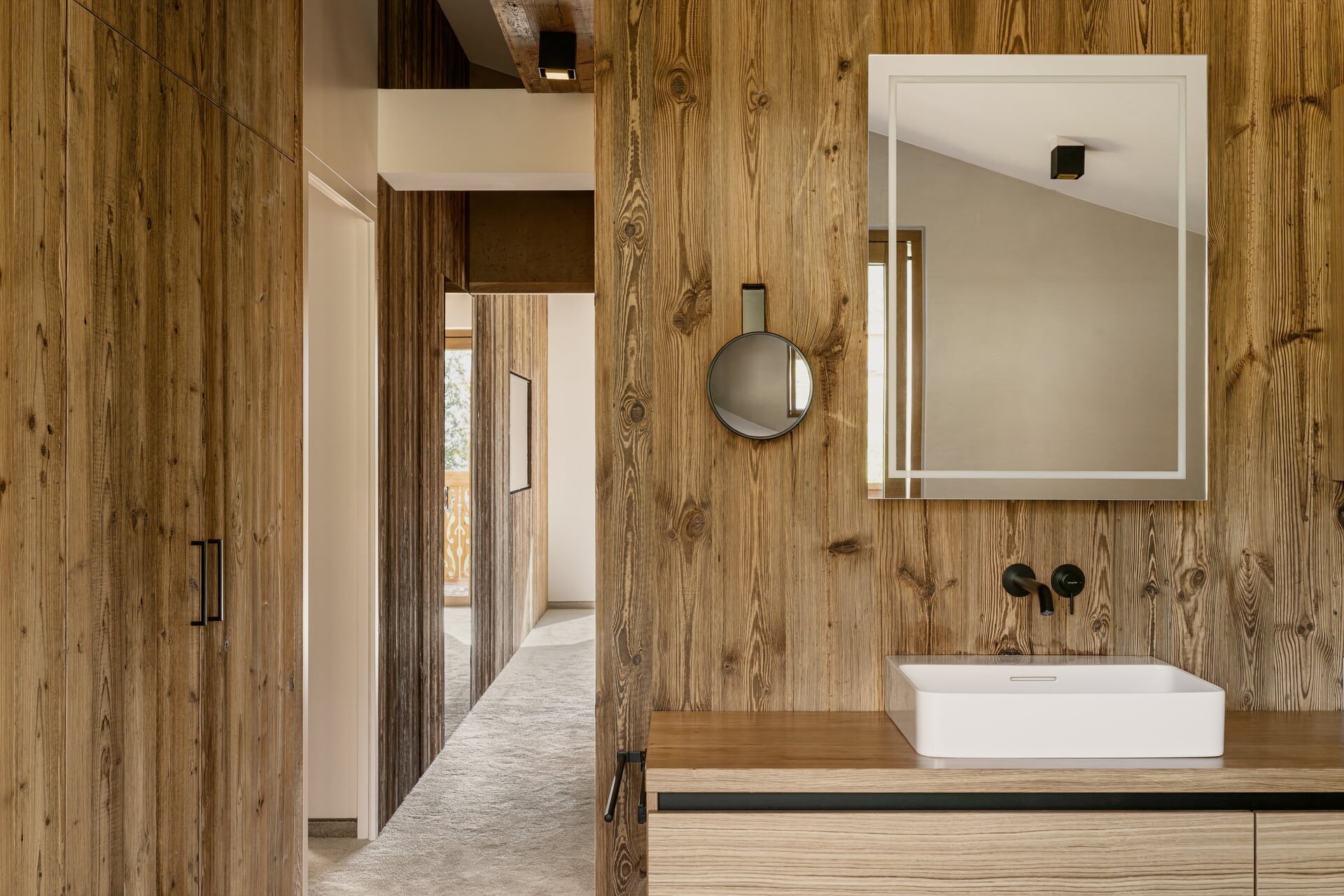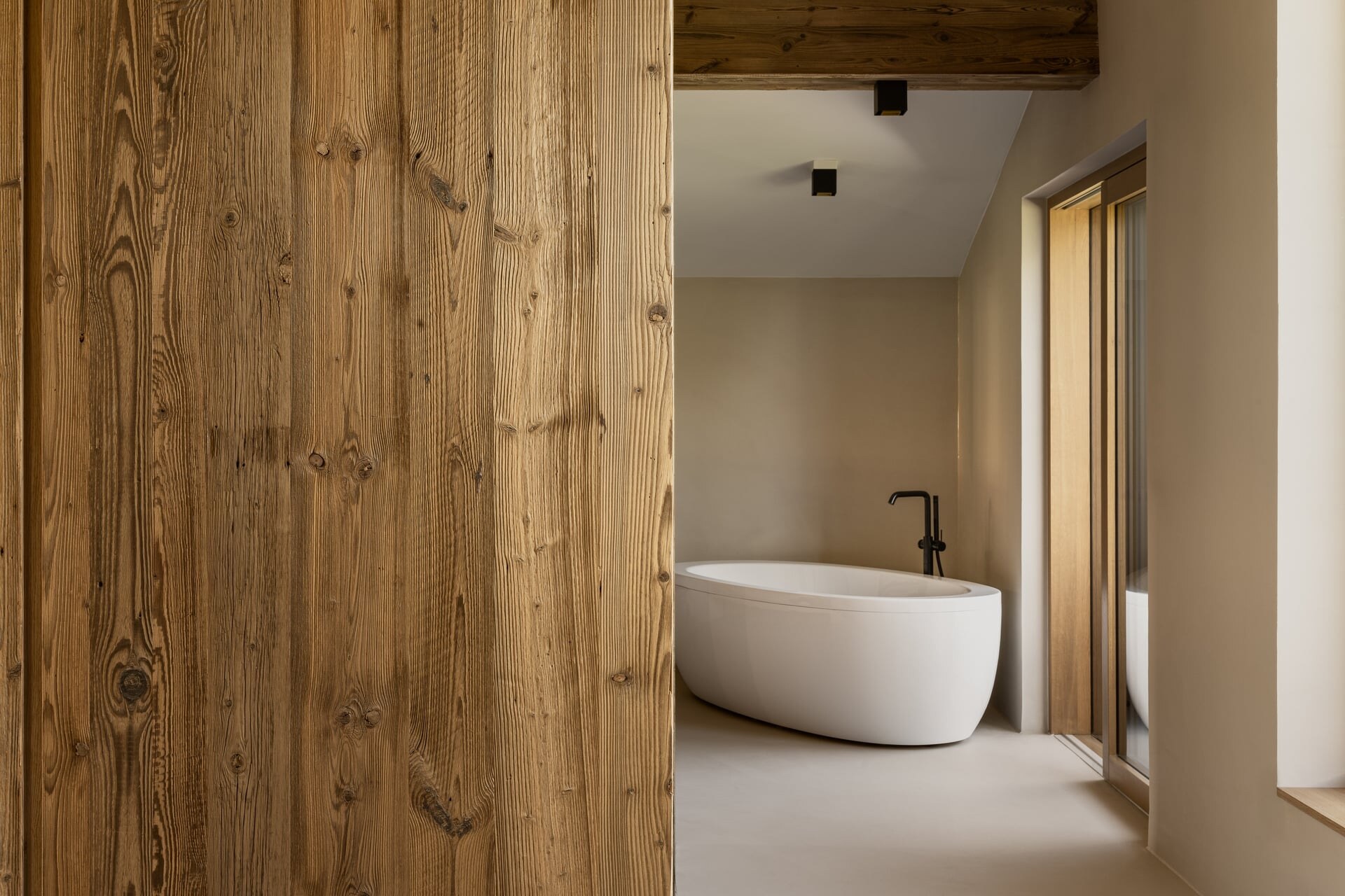 Das Design interpretiert alpine Materialien neu und verbindet sie mit zeitgenössischer Klarheit. Lebendig anmutendes Fichtenholz sorgt für Wärme und Charakter, fließende, hellgraue Oberflächen für Ruhe und architektonische Reduktion. Schwarze, minimalistische Armaturen treffen auf weich geformte Keramikelemente in Weiß – ein spannungsvolles, zugleich harmonisches Zusammenspiel für ein luxuriöses Spa-Erlebnis in stilvollem Ambiente.